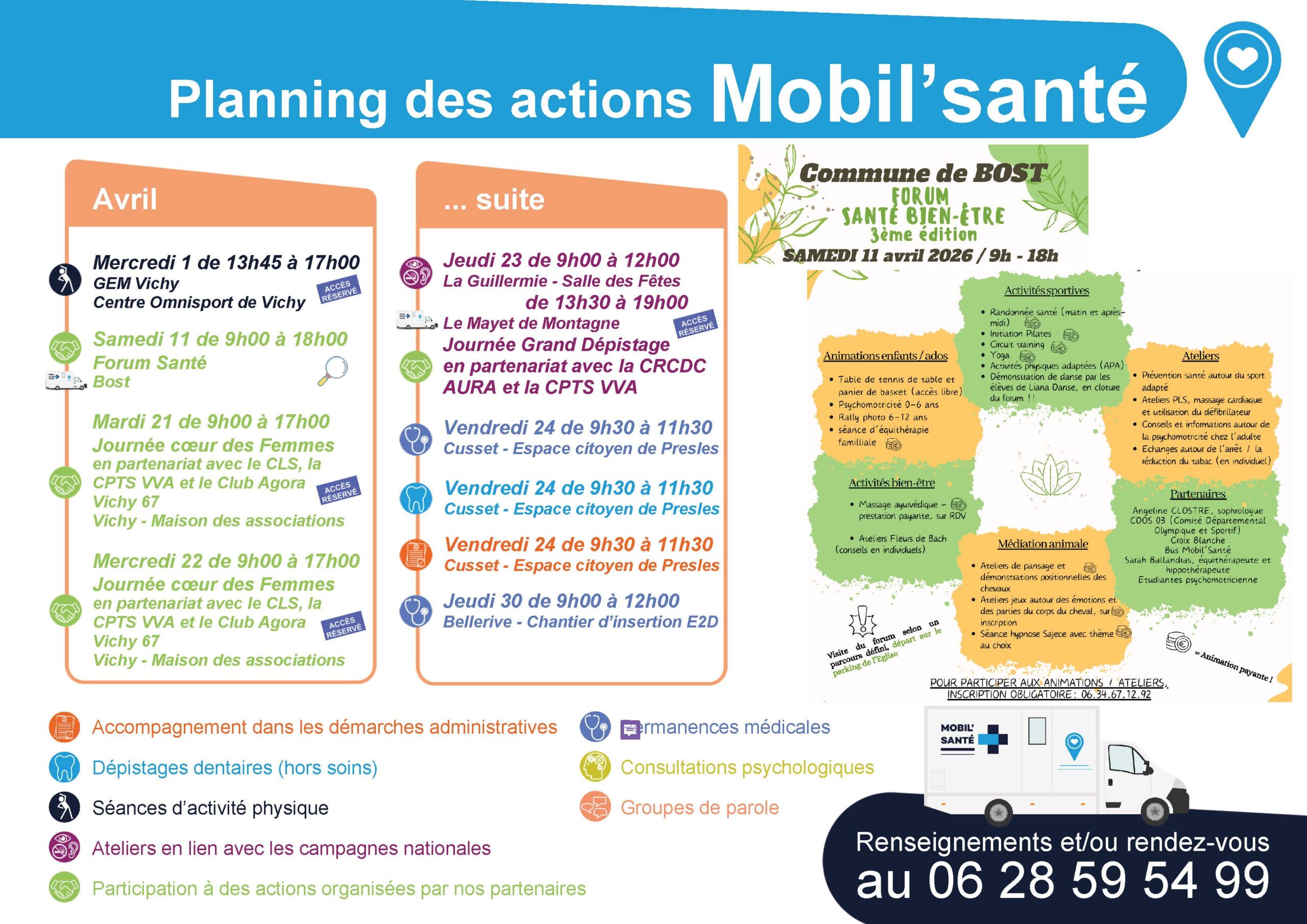 Des actions de prévention, de dépistage et de sensibilisation sont menées sur le territoire, et les agents apportent également une fonction ressource au sein de Vichy Communauté. L’équipe dispose d’un bus aménagé en cabinet médical itinérant, offrant des conditions d’accueil adaptées, incluant une salle d’attente et un espace de consultation respectant le secret médical et professionnel. Ce cadre permet également la libre expression des personnes accueillies. Engagé dans la lutte contre les violences faites aux femmes, Mobil’Santé participe, en lien avec la cellule de coordination du CCAS de Vichy, à la prise en charge des victimes. Des outils ont par ailleurs été créés et proposés à différents partenaires dans le cadre d’actions de sensibilisation à cette problématique sociétale.